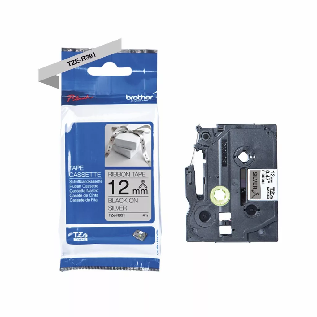 **TZe-R931 Ezüst selyem szalag fekete színű feliratokhoz** * Szalag típusa: Selyem * Szalag szélessége: 12 mm * Szalag hossza: 4 m * Szalag színe: Ezüst *Felirat színe: Fekete