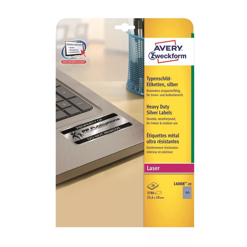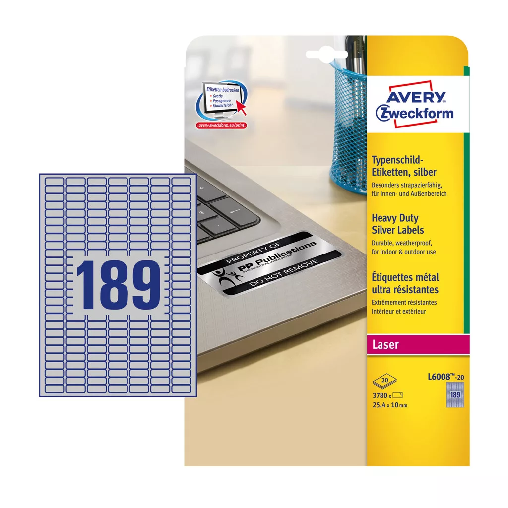Címke mérete: 25,4 x 10 mm Doboz tartalma: 3780 címke címke - 20ív/doboz (189 címke/ lap) Ezüst poliészter címke, strapabíró időjárásálló címkéi lézernyomtatókhoz kifejezetten a tulajdon tárgyaink megbízható és professzionális felcímkézéséhez fejlesztve készültek. A strapabíró, poliészter filmből készült etikettek olaj, szennyeződés-, UV- és hőállóak (-40°C és +150°C között), vízállóak és szakadásbiztosak. Az ezüst ipari etikettek tökéletesek például vállalatok tulajdonainak, elektronikai berendezéseinek és azok alkatrészeinek felcímkézésére. Tervezze meg és nyomtassa ki ezüst ipari címkéit gyorsan és egyszerűen - ingyenes szoftverünkért és sablonjainkért látogasson el a http://www.avery.hu/templates-software/ weboldalra vagy használja a Microsoft® Office csomagokba beépített sablonjainkat! Kifejezetten lézernyomtatókhoz fejlesztve.Katalóguskód: 25337
