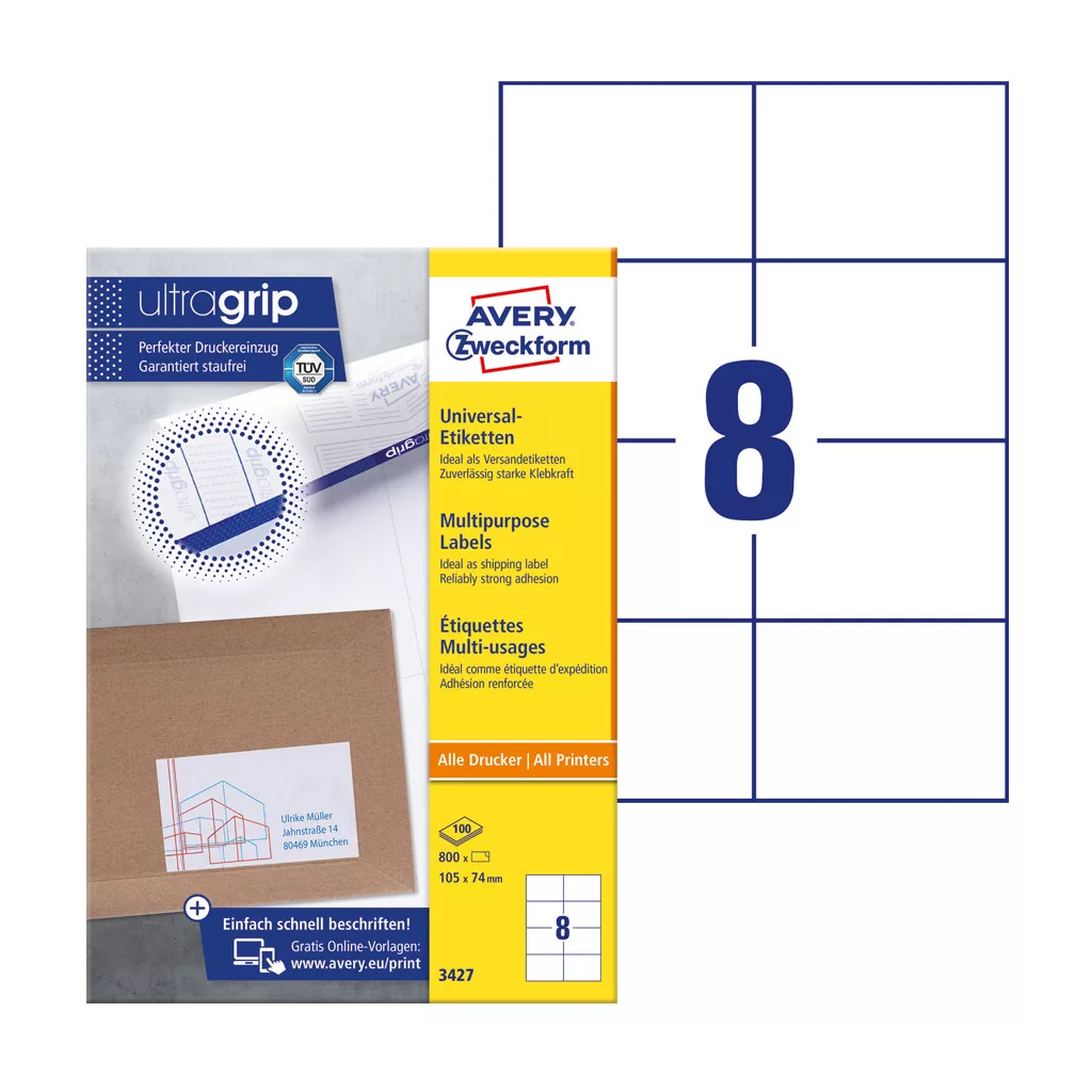 Címke mérete: 105 x 74 mmDoboz tartalma: 800 darab címke - 100 ív/ doboz (8 címke/lap) Tökéletesen alkalmasak például jóváhagyásokhoz és nyomtatványok megcímkézéséhez. Biztos lehet az elakadásmentes nyomtatásban, hiszen ragasztómaradvány nem kerül a nyomtatóba. Extra erős tapadás: a címkék meggyőző erővel tapadnak papírra, kartonra, üvegre és műanyagra egyaránt. Tökéletes pl. borítékokra, csomagokra, iratrendezőkre vagy fóliákra. Az univerzális etikettek minden igényt kielégítőek, tűéles képeket, kiváló toner tapadást és elkenődésmentes felületet biztosítanak. Környezetbarát, FSC® minősítésű és klórmentes eljárással fehérített. Tervezze meg és nyomtassa ki címkéit gyorsan és egyszerűen - ingyenes szoftverünkért és sablonjainkért látogasson el a http://www.avery.hu/templates-software/ weboldalra vagy használja a Microsoft® Office csomagokba beépített sablonjainkat! Optimalizált minőség tintasugaras, lézer és színes lézer nyomtatókhoz, fénymásolókhoz. Katalóguskód: 25266