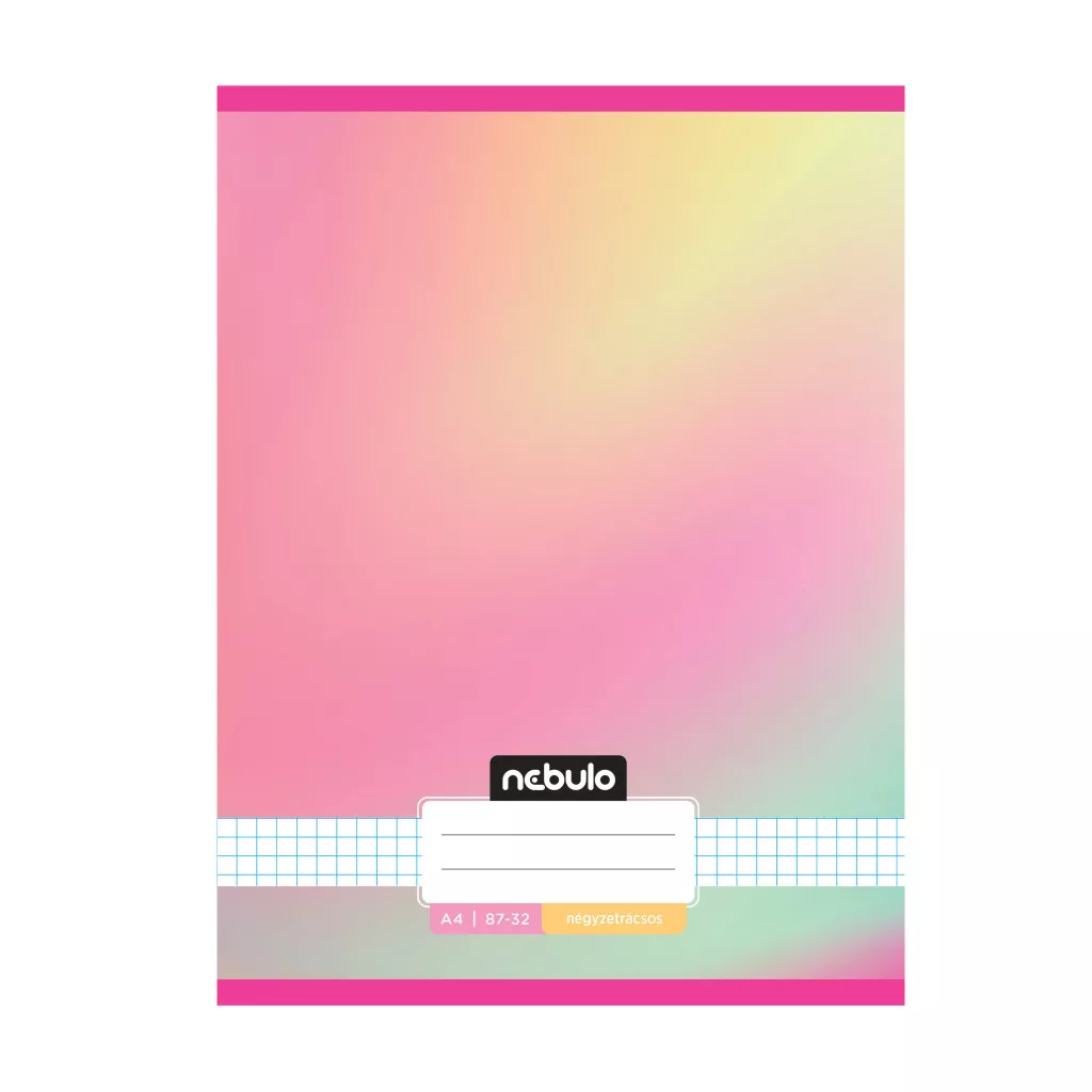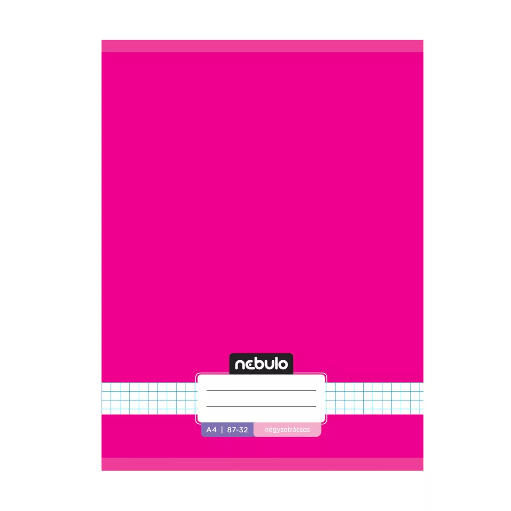A/4-es tűzött iskolai négyzetrácsos füzet, 32 lapos (81-32). 12 db füzet (6 különböző minta: Monochrome=egyszínű, Gradient=színátmentes, 2db / minta) van egy csomagban. 70 g-os füzetlapok és 200 g-os műnyomó borító fényes fóliával.
