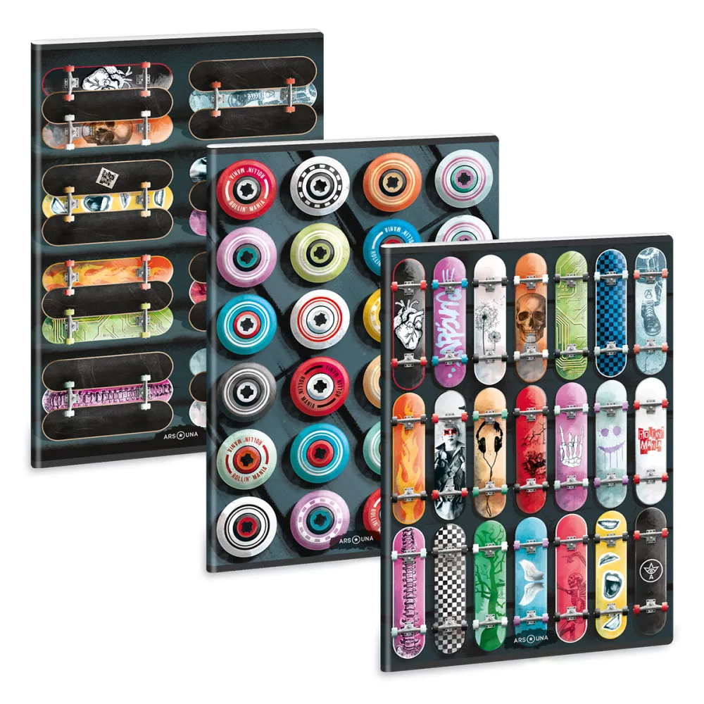 A/4-es méretű, prémium minőségű négyzethálós füzet. 40 lapos, belseje 75 gr-os, fehér papírból. Az oldalak nem margózottak. Borítója lekerekített sarkokkal, 350 gr-os fényes műnyomó kartonra, 4 szín nyomással, matt soft-touch fóliával készült. Különböző mintájú füzetek a 10-es fólia csomagon belül vegyesen csomagolva, a füzeteknek megegyezik a kódja.