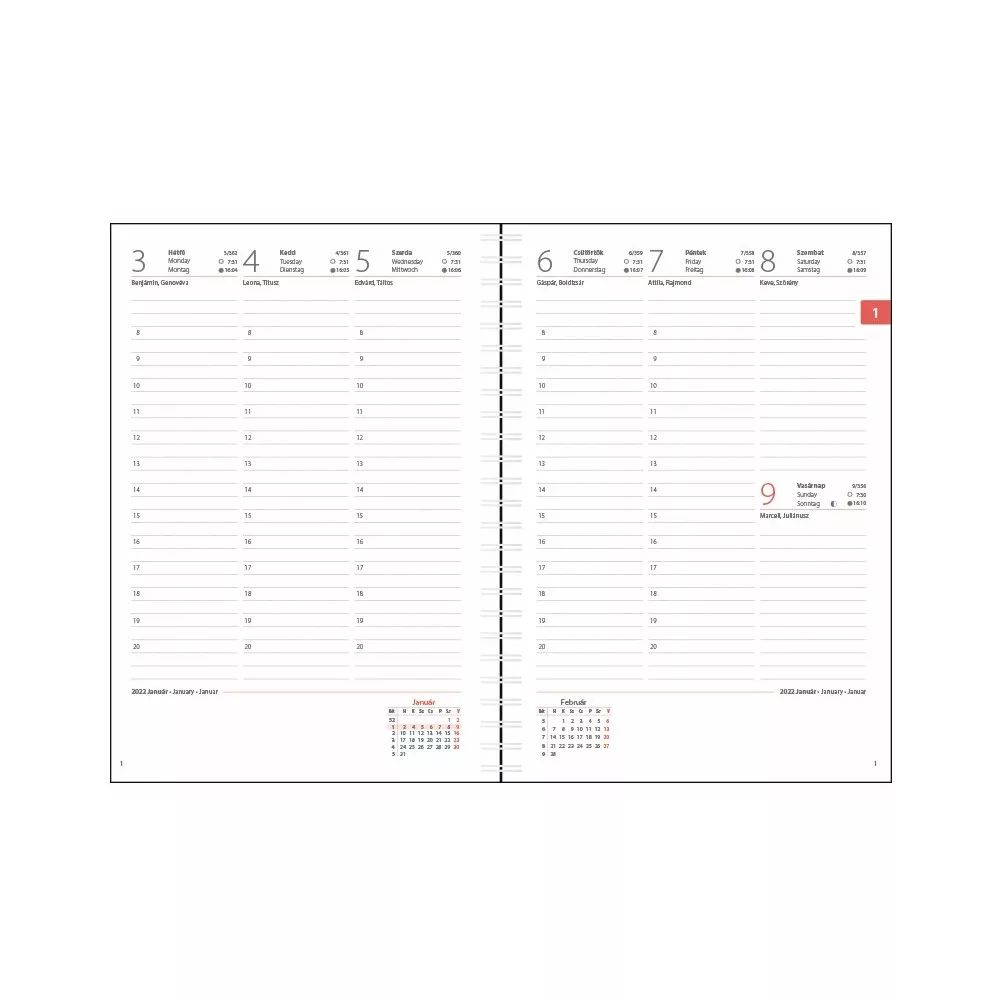 • Naptár beosztás: Heti (1 hét 2 oldalon)