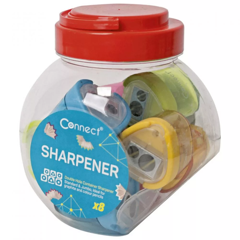 Műanyag fedeles tartályos 2 lyukú hegyező. Normál és jumbo ceruzákhoz. 4 féle vegyes színben. Katalóguskód: 22861