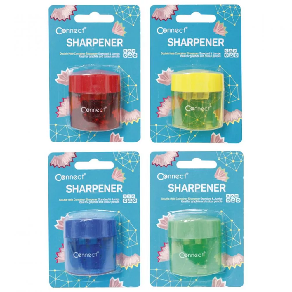 Műanyag fedeles tartályos 2 lyukú hegyező. Normál és jumbo ceruzákhoz. 4 féle vegyes színben. Katalóguskód: 22873