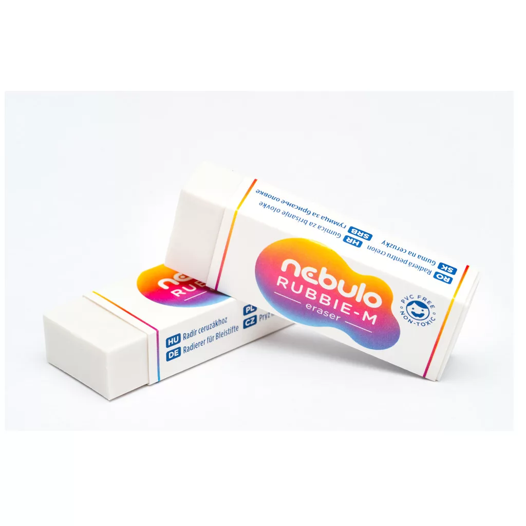 Nebulo Rubbie minőségi gumi radírok papír tokban. Ideálisak ceruzavonalak radírozásához. PVC mentesek, nem tartalmaznak egészségre káros anyagot. A radír forgácsmentes anyagból készül, így a radírozás során a forgács nem hullik apró darabokra, ezzel biztosítva a tisztább, foltmentes munkát. Rubbie-M mérete: 59*21*11 mm Katalóguskód: 27168
