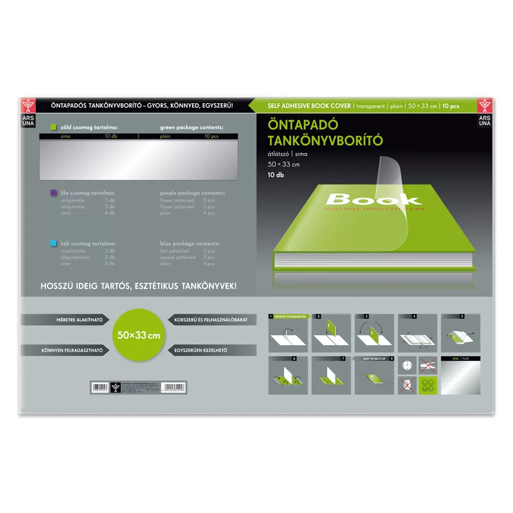 Öntapadós műanyag tankönyvborító, 50x33 cm méretű. Egy csomag 10 db átlátszó borítót tartalmaz. Méretre vágható. Tankönyvekhez és füzetekhez is használható. Anyagvastagsága 0,08 mm, 80 micron. Katalóguskód: 55344