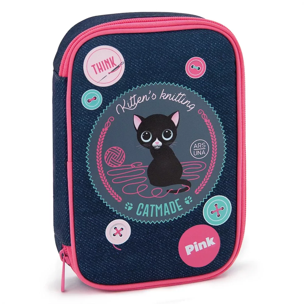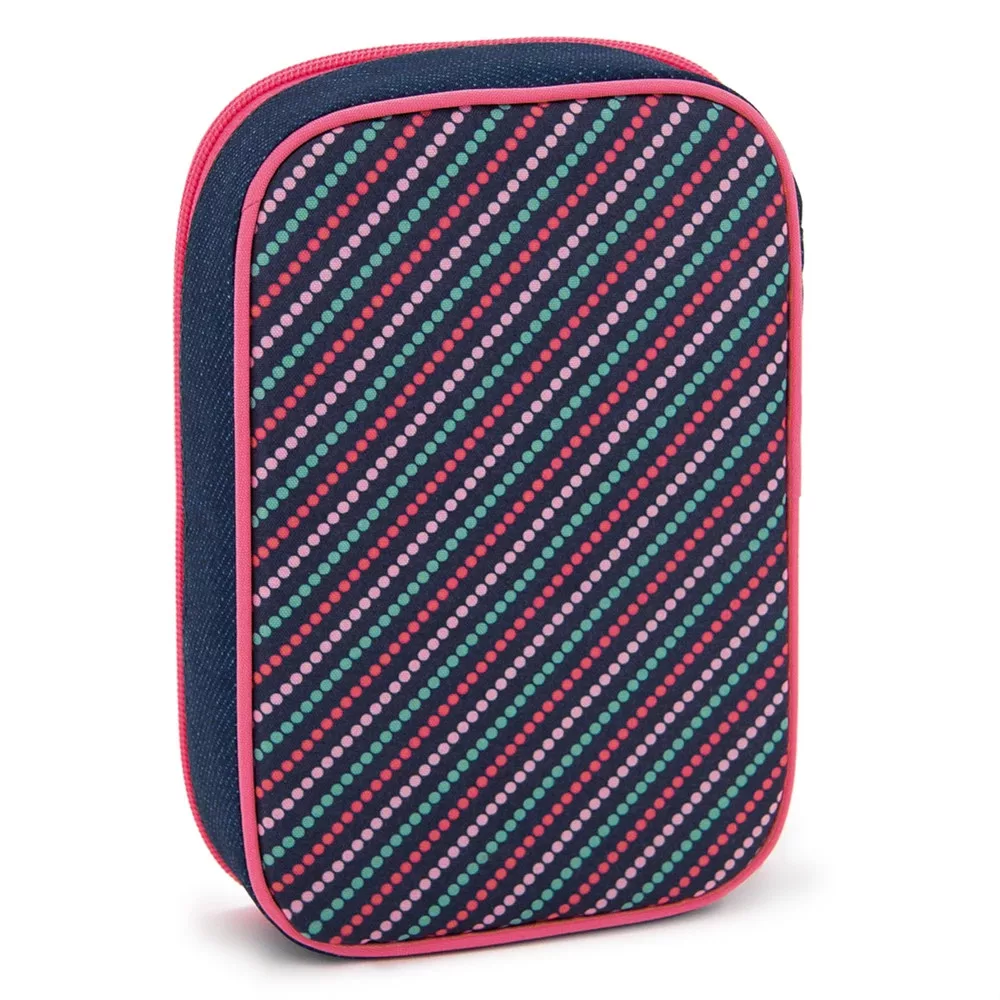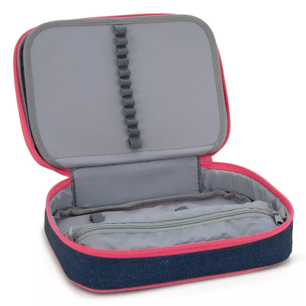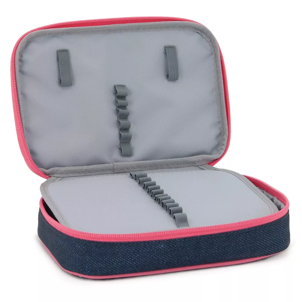 Többszintes, töltetlen, cipzáras tolltartó. Belül textillel bevont merev lapokkal, gumis kialakítással 30 ceruza számára az írószerek tárolásához és egy cipzáras belső zsebbel.